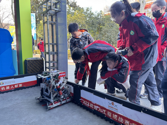 2025年12月,杭州市学军中学vex战队成员在杭州市中小学生科技节,向现场中小学生开展机器人教学展示,并组织实践对抗体验。 受访者供图