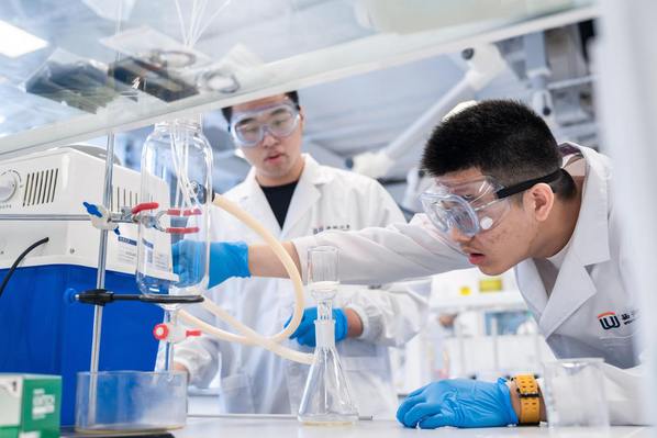 2025年,宁波镇海中学学生赴西湖大学参加化学夏令营,在实验室做实验。 受访者供图